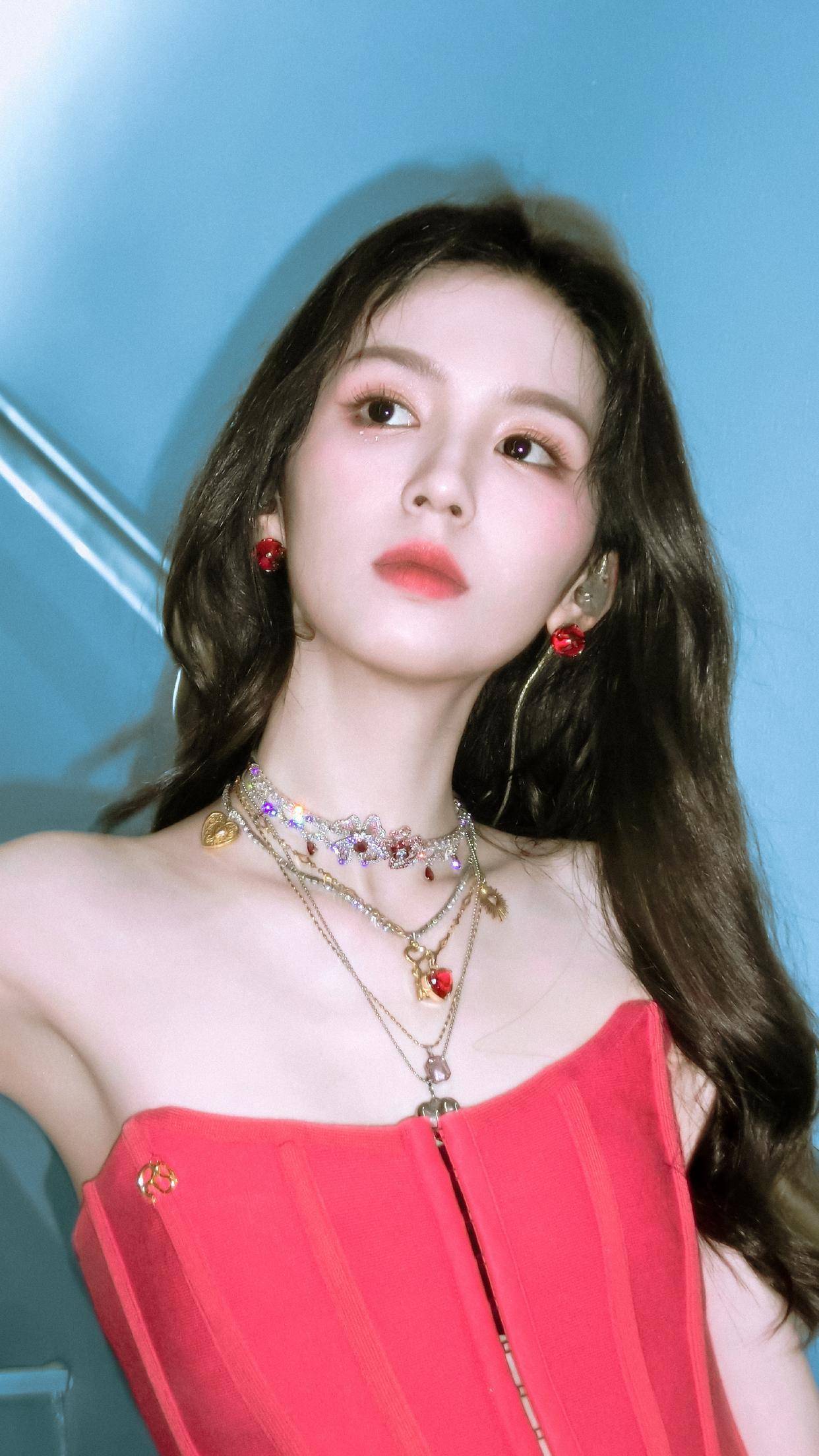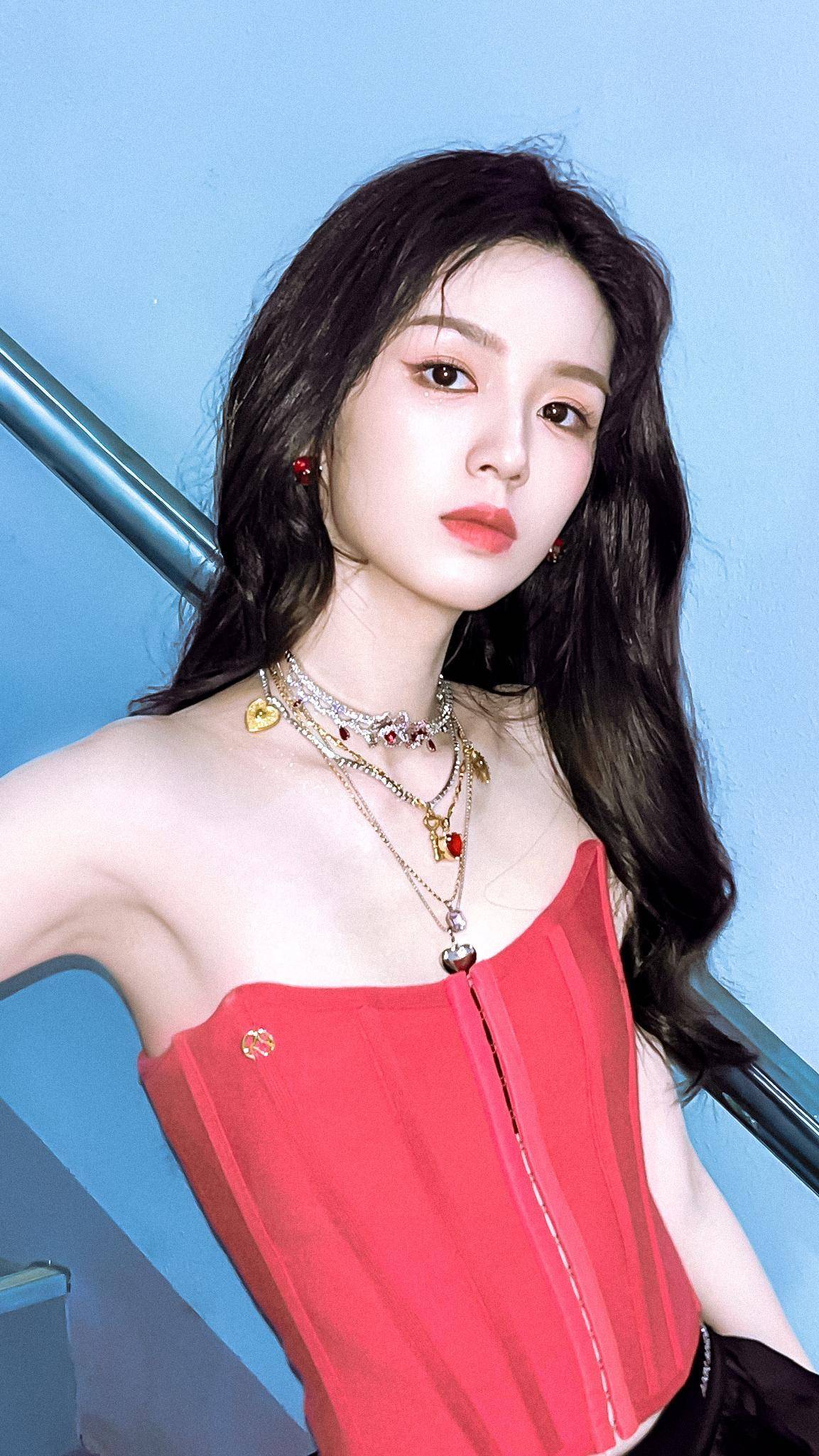 当周也身着红色抹胸束腰装亮相时,瞬间成为视觉焦点。这款corset(束腰装)采用亮眼的红色,抹胸设计大方展露肩颈线条,束腰版型则巧妙勾勒出纤细腰肢,将复古与性感完美融合。搭配的黑色荷叶边短裙,增添了几分甜酷感,整体造型层次丰富又极具个性。
