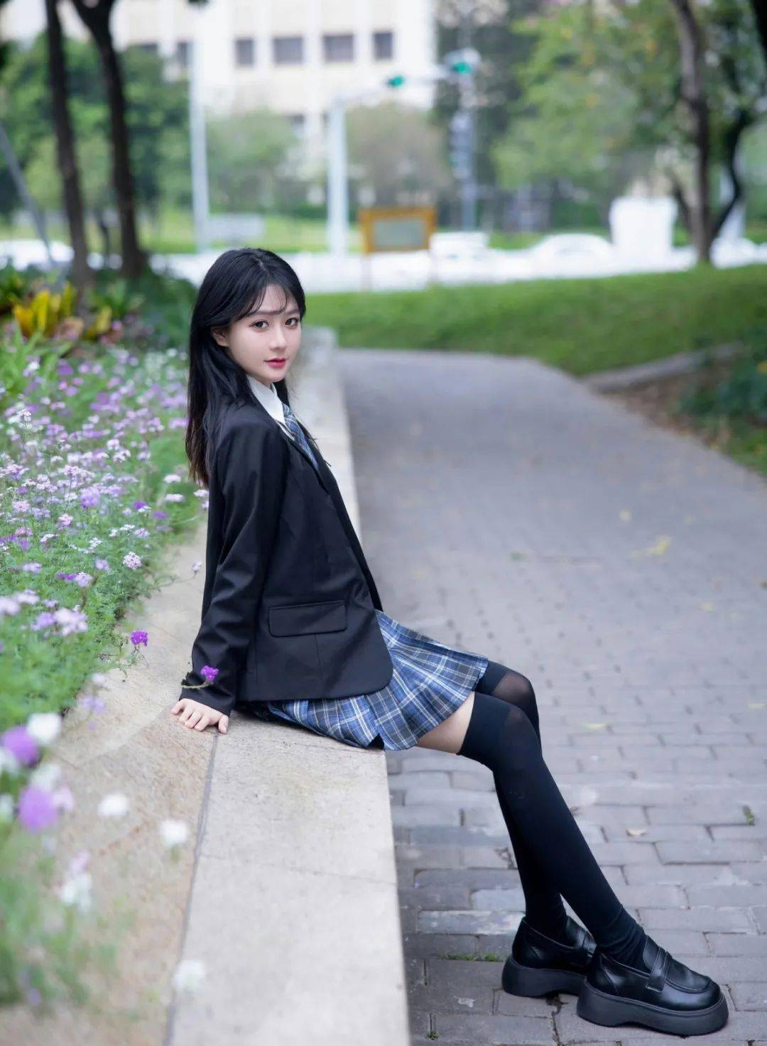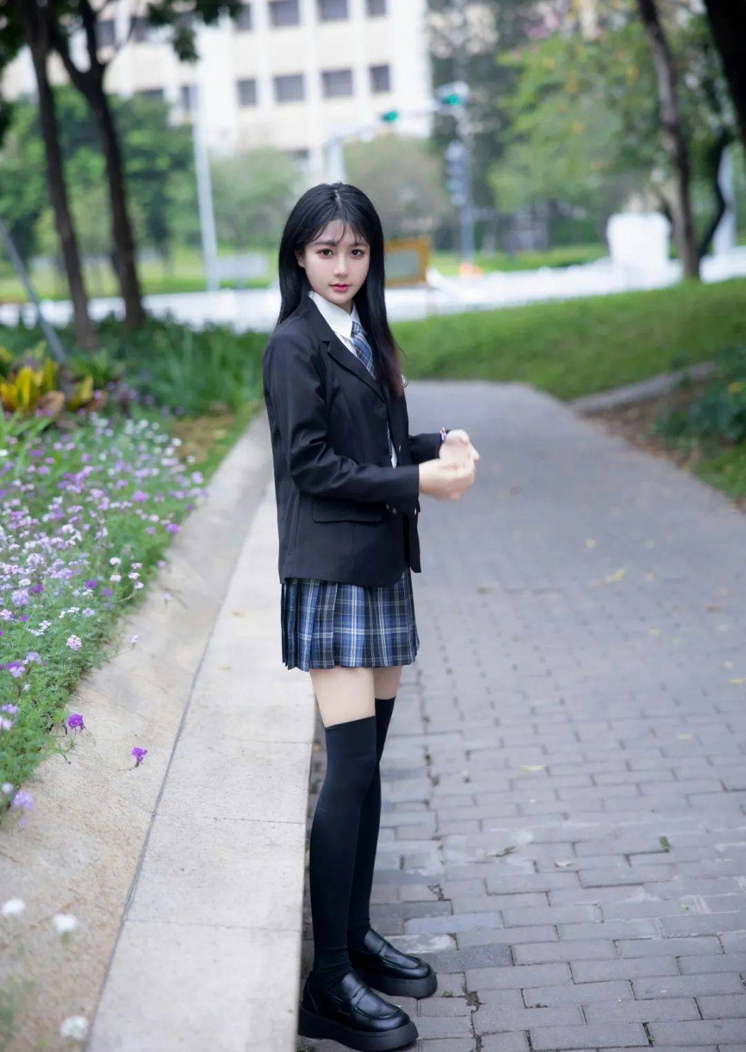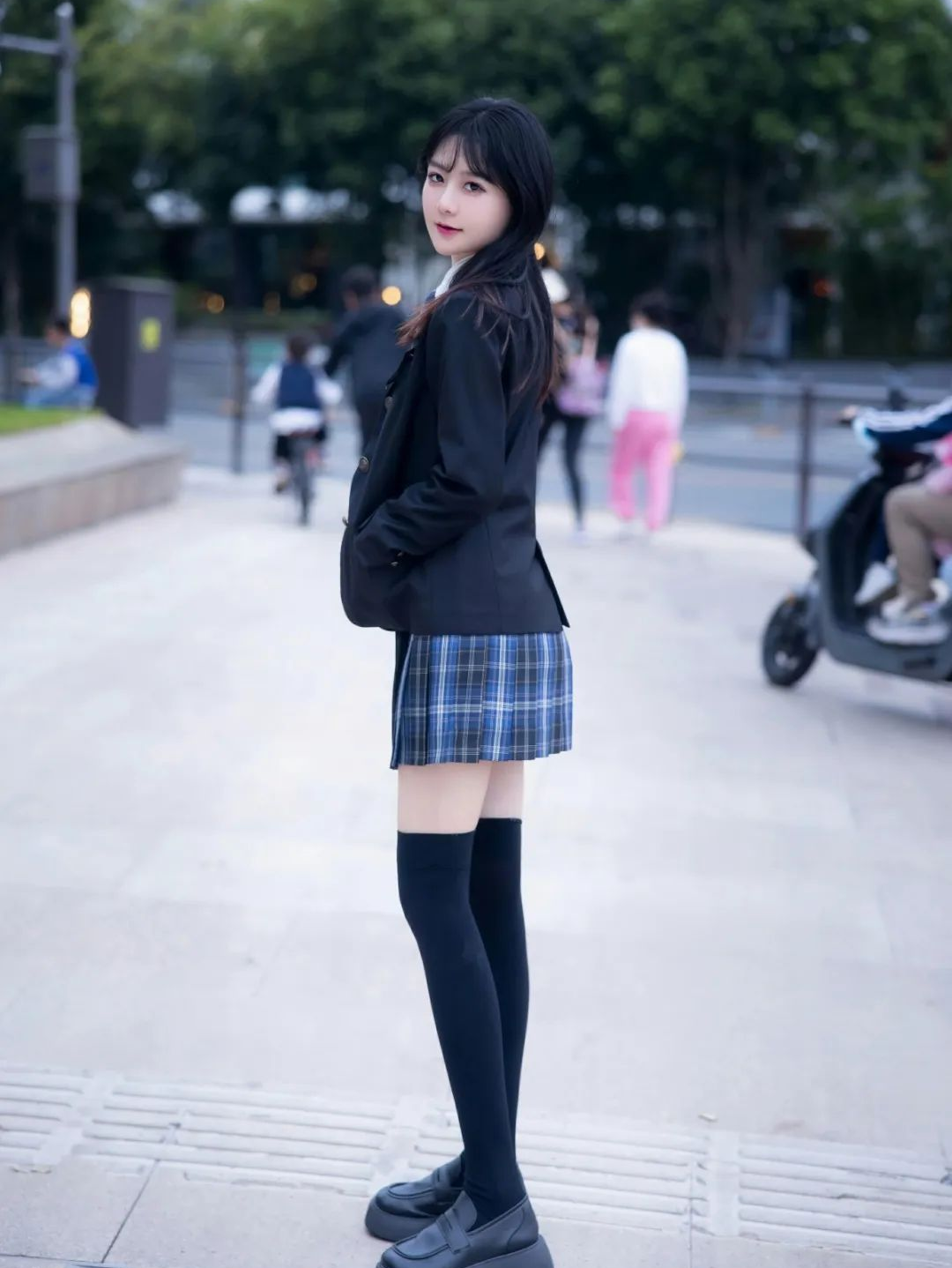 黑色丝袜包裹着修长白皙的双腿,勾勒出一条曼妙的曲线,仿佛是一首动人的诗篇。百褶裙裙摆下的黑色丝袜既为整体造型增色添彩,又为美女的双腿赋予了一层神秘感。每一步的踏出都散发出一种婀娜多姿的氛围,吸引着路人纷纷驻足观望。