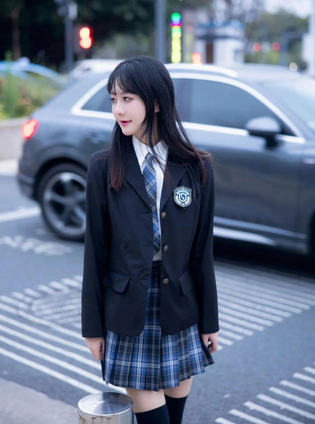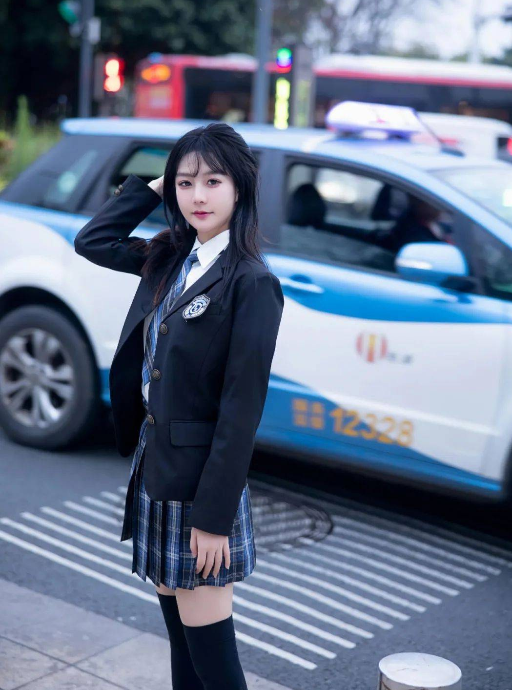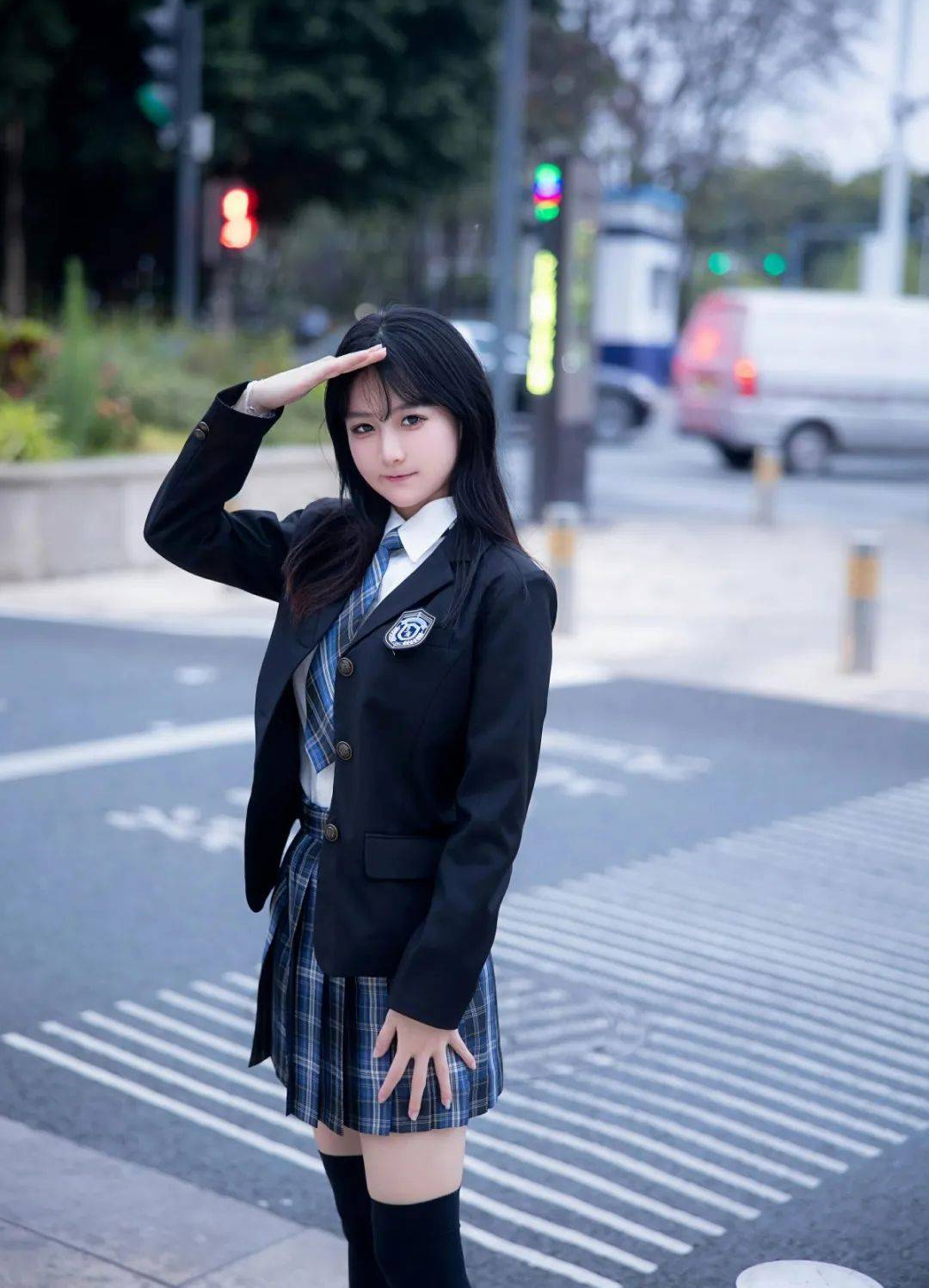整个画面仿佛是一场JK美女的时尚秀,她在街头演绎着青春的美好。JK制服的设计将女性的甜美和俏皮完美结合,展现出一种迷人的魅力。百褶裙与黑色丝袜的巧妙搭配,使整体造型更显独特,时尚感十足。