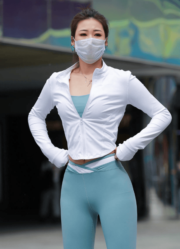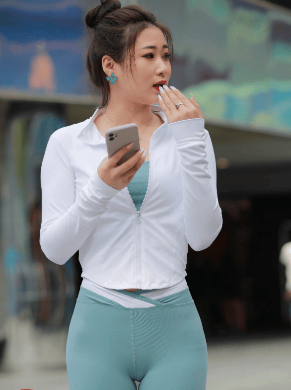 下犬式时,掌心扎实贴地,腰背绷成流畅弧线,天蓝色裤身贴合腿部线条,小腿肌肉发力的弧度清晰却不突兀。邻居阿姨晨练路过,隔着栏杆夸赞:“这颜色真清爽,看着就舒服!”晓晨抬头浅笑,发梢随动作轻扫背心领口,天蓝与肤色相映,更显肌肤通透。