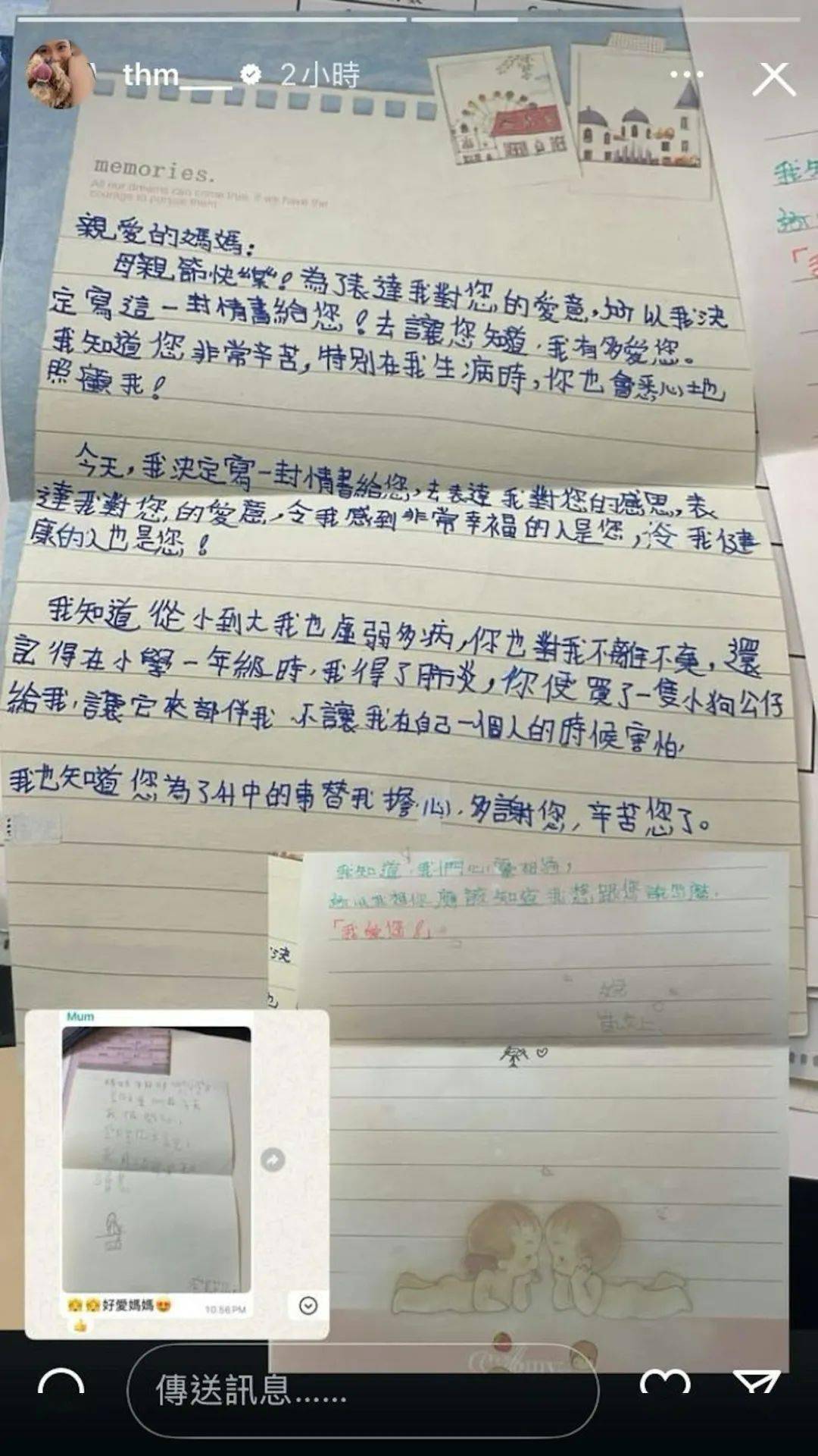 从信中可以看到,邓凯文多次感谢妈妈在她生病时照顾她,亦提到她在一年级时染上肺炎,所以十分感激妈妈对她不离不弃的照顾。言词真诚又有爱,相信当年她的妈妈收到信后,一定是百般在滋味心头。