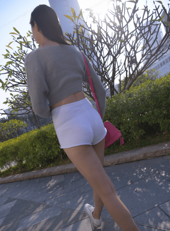 蹲在路边拍落叶时,双腿微微弯曲,白色短裤将大腿的紧致轮廓清晰呈现,灰色毛线衣的下摆随动作轻轻上移,腰侧的肌肉线条隐约可见;站在路口拍街景时,她单手举着手机,另一只手自然垂在身侧,身体微微后仰,腰背保持挺拔弧度,白色短裤衬得双腿愈发修长,步伐从容却带着气场,丝毫没有因反季穿着而显得局促,反而像掌控了整个街头的焦点。