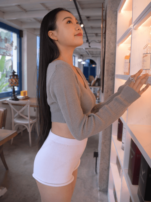 衣长卡在腰线以上 2 厘米,自然露出一小节紧致腰腹,若隐若现的马甲线在白色短裤的映衬下格外明显,打破了毛线衣 “显臃肿” 的刻板印象,反而透着对身材的自信与对穿搭的掌控力。袖口被轻轻挽至手肘,露出纤细的小臂,搭配一枚银色细手镯,为温暖的毛线衣增添了几分精致,让反季穿搭既有个性又不失细节感。