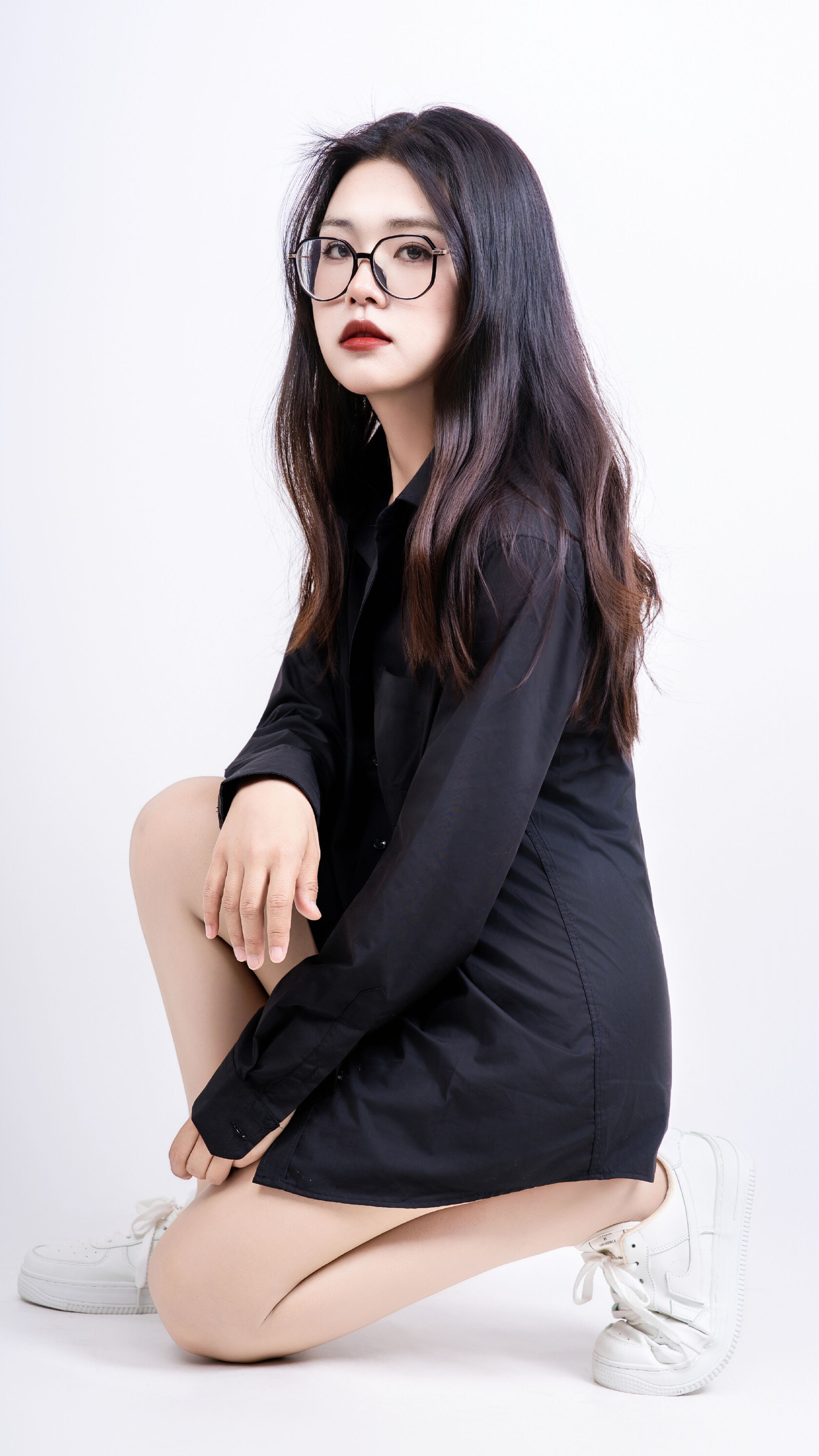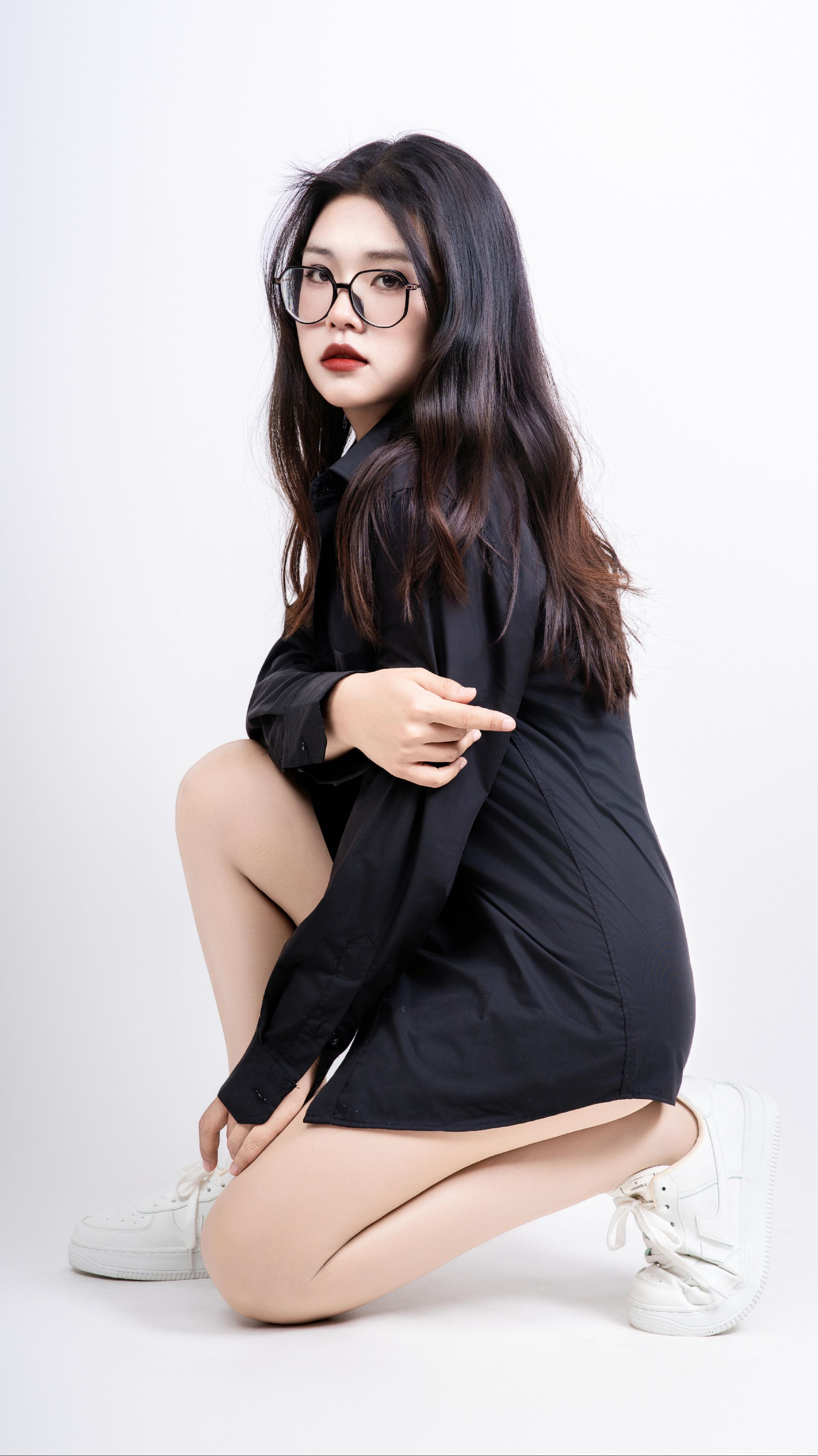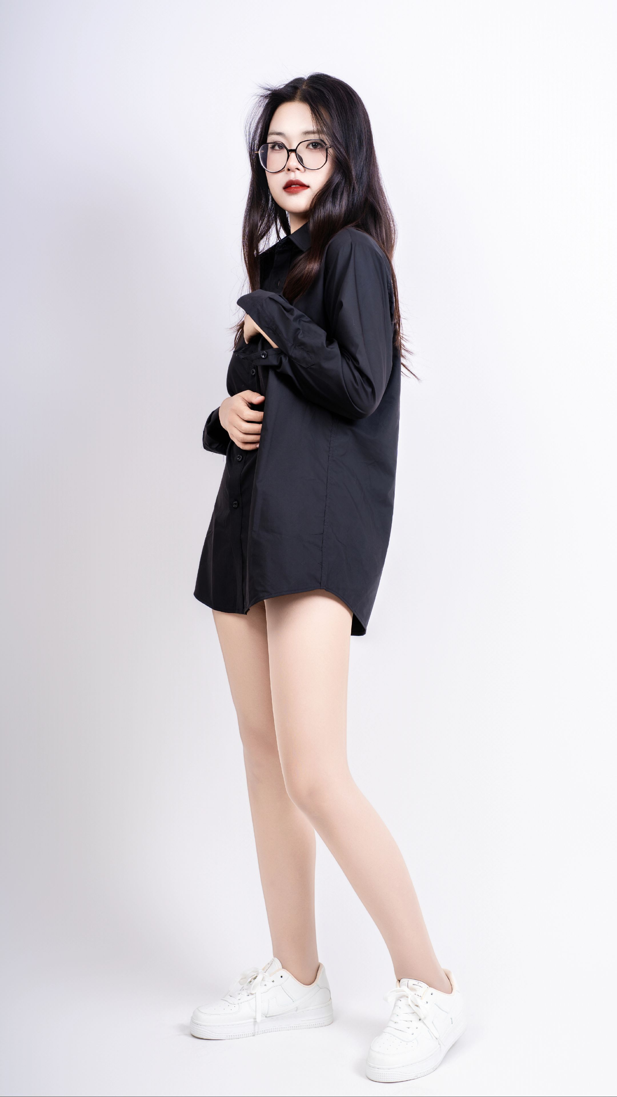 【时尚】当女生戴上眼镜,穿黑衬衫肉丝运动鞋_